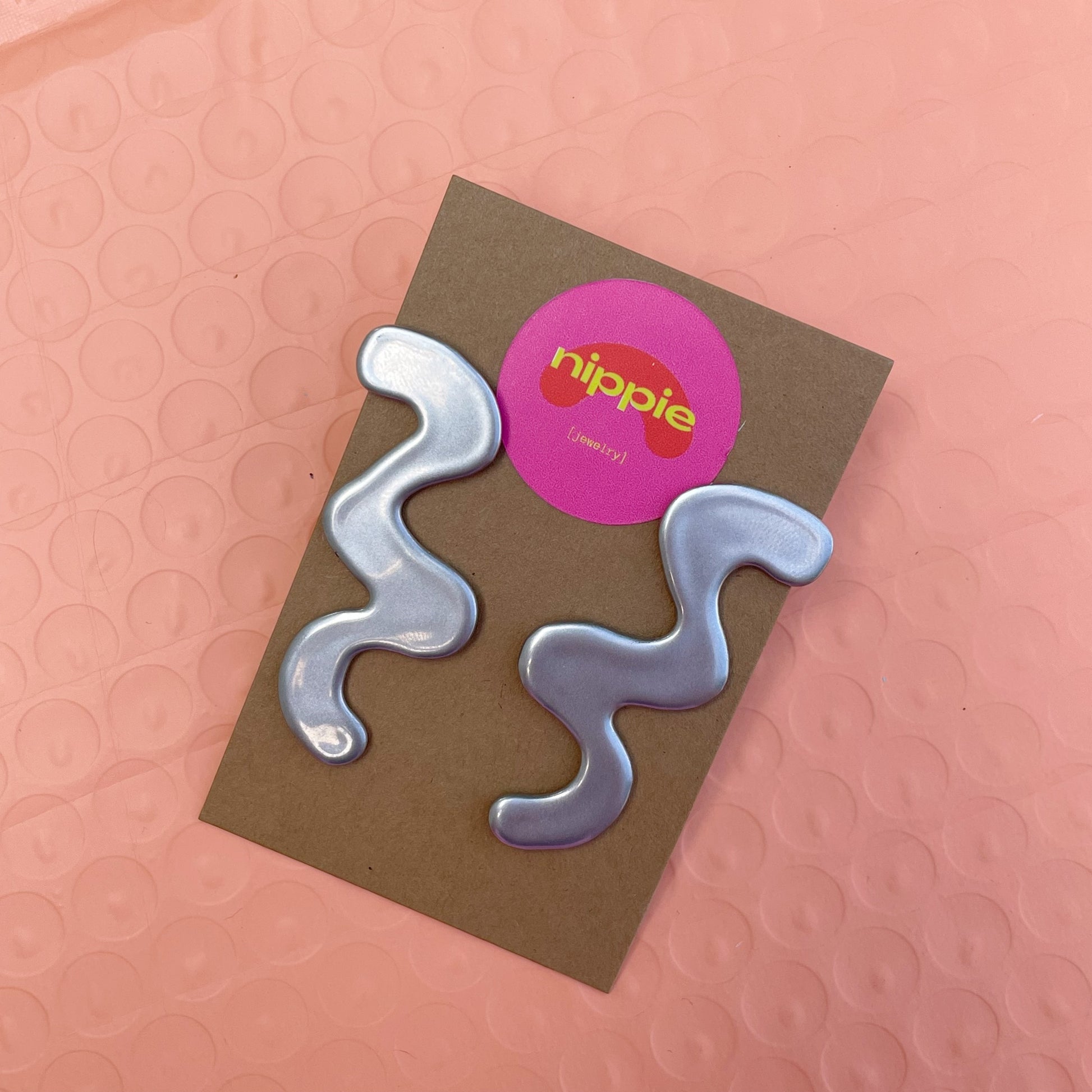 Gorgeous shiny silvery chrome squibbles. Medium large. Drippy. Pictured with shimmer lavender ovals and chrome wire bows. Powdercoated hand-pierced copper with sterling silver posts & nuts.